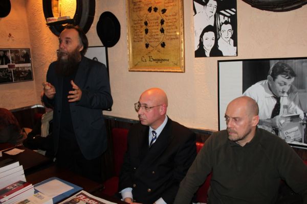 Alexander Dugin, Christian Bouchet and Alain Soral during a meeting in France.